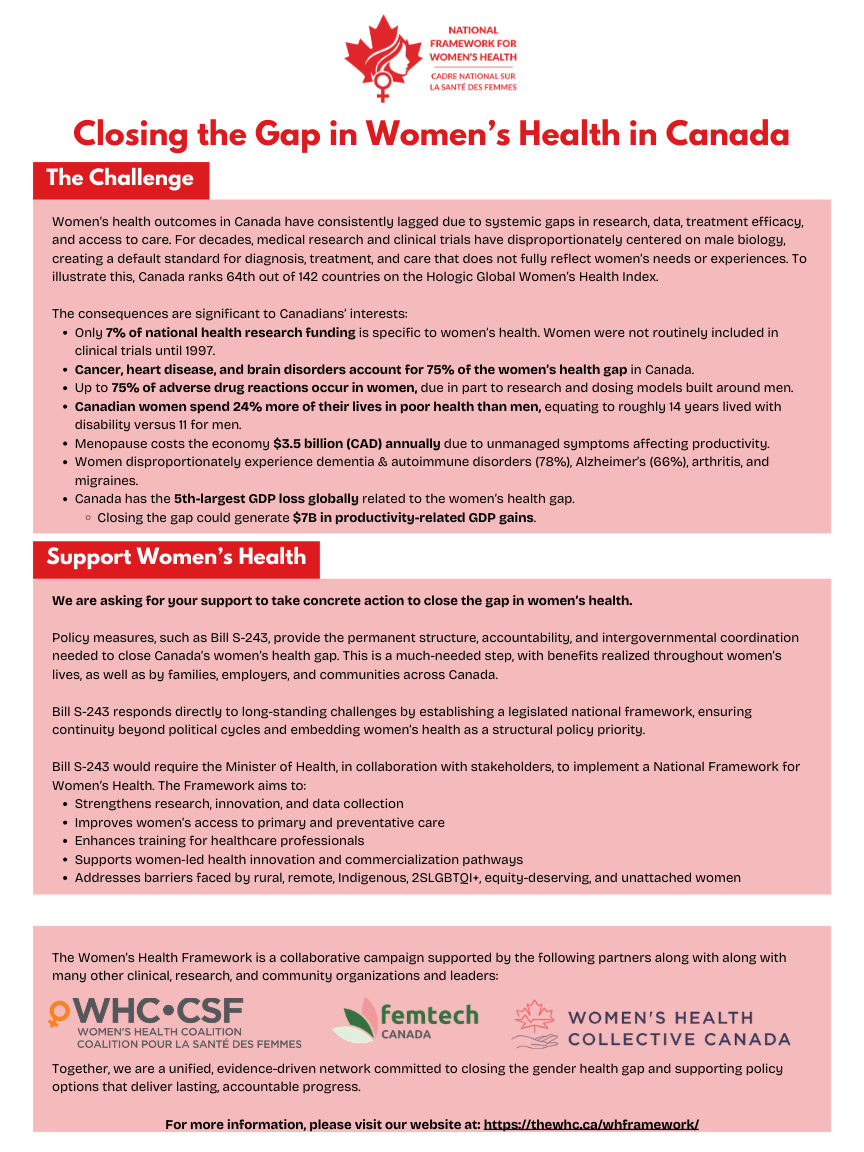 Executive Director, Wendy Gerhart,  joined national partners in Ottawa for two important days supporting Bill S-243, the National Framework for Women’s Health led by Senator Daniele Henkel. We met with elected officials, including Federal Minister of Health, Majorie Michel, who showed strong engagement and encouraging support, reinforced by evidence, including the $37 billion economic opportunity tied to advancing women’s health.